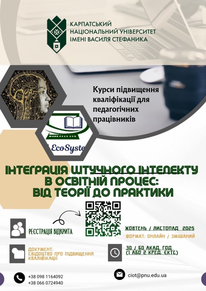 Центр інноваційних освітніх технологій «PNU EcoSystem» Карпатського національного університету імені Василя Стефаника запрошує педагогічних (науково-педагогічних) працівників, які забезпечують навчання здобувачів освіти у закладах загальної середньої та фахової передвищої освіти, на курси підвищення кваліфікації на тему: “Інтеґрація штучного інтелекту в освітній процес: Читати далі